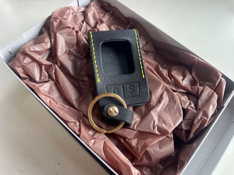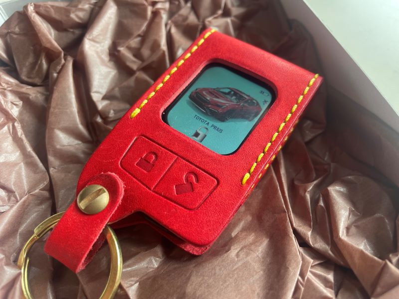 どちらも金リングで革と対照的な色のステッチをあしらって頂きました。現在は新品の為、艶の無いバックスキンのような肌に見えますが、経年進化(劣化X)で艶が出てきます。野球のグローブとか、高級革素材をイメージして頂くと間違いありません。この先、7756V(先の白黒液晶リモコン)にあったようなゴム製のケースが出て来て、半額位で流通すると思われますが、お車を大事にされる、拘る方には是非!!!(ゼシ!)